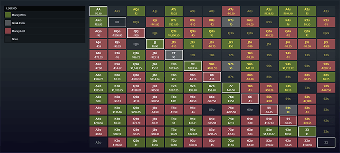 底牌分页显示所有组合的矩阵,提供给您玩过的每底牌的总净收入。