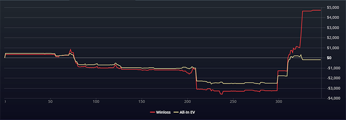 红线显示您的实际利润和损失,而EV线显示相同范围的底牌的统计数据价值来作为比较。